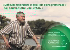 La BPCO est habituellement causée par l'inhalation de substances nocives, comme la fumée de cigarette, sur une longue période de temps. C’est une maladie incurable, cepedant plus tôt la maladie est découverte, plus son évolution peut être ralentie et la qualité de vie maintenue. Sous le slogan « Du souffle pour la vie », la Ligue pulmonaire lance donc une nouvelle campagne de plusieurs années, axée chaque année en novembre sur la BPCO. Grâce à des spots publicitaires et des affiches, la Ligue pulmonaire fournit de l'information sur la BPCO, autour de la Journée mondiale de la BPCO, qui a lieu le 14 novembre. Le test de risque en ligne de la Ligue pulmonaire fournit les premières indications d'une maladie atteinte par la BPCO, et plusieurs ligues pulmonaires cantonales offrent une mesure gratuite de la fonction pulmonaire à différents endroits, au cours du mois de novembre. Faites-vous tester.